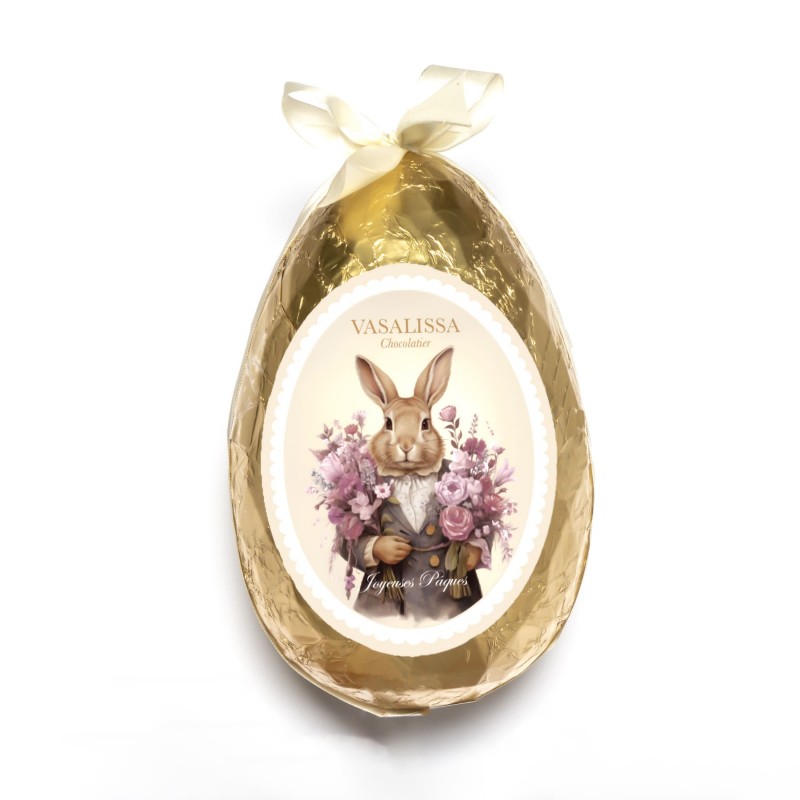 DESCRIPCION: Huevo de Pascua de 10cm de alto en chocolate con leche. Sorpresas: almendras bañadas y mix de figuras. (Los colores de los envoltorios pueden variar)