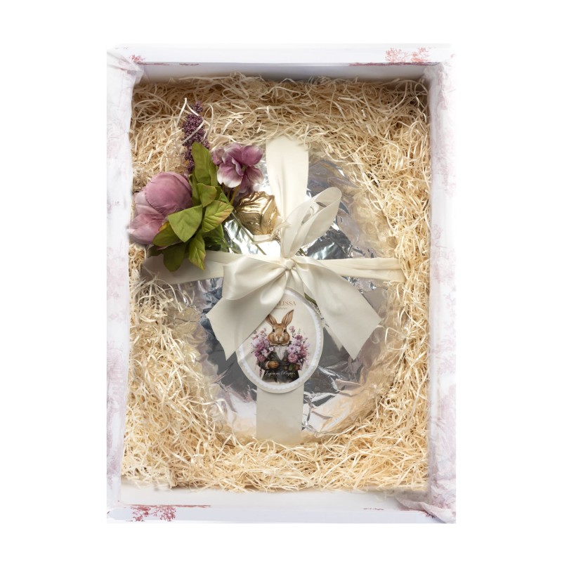 Caja con caja de figuritas de pascua , baúl con 6 bombones, almendras bañadas, tableta de pascua, conejo chico de leche.
