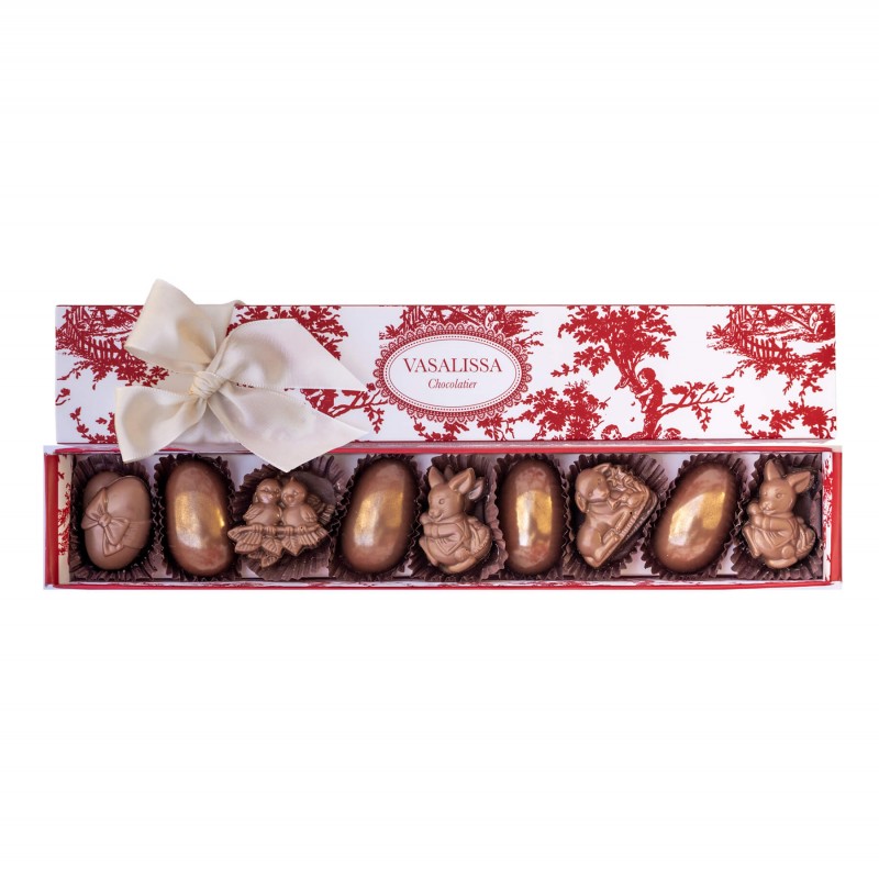 Figuras de Pascua de chocolate con leche y medios huevos de chocolate con leche rellenos de dulce de leche