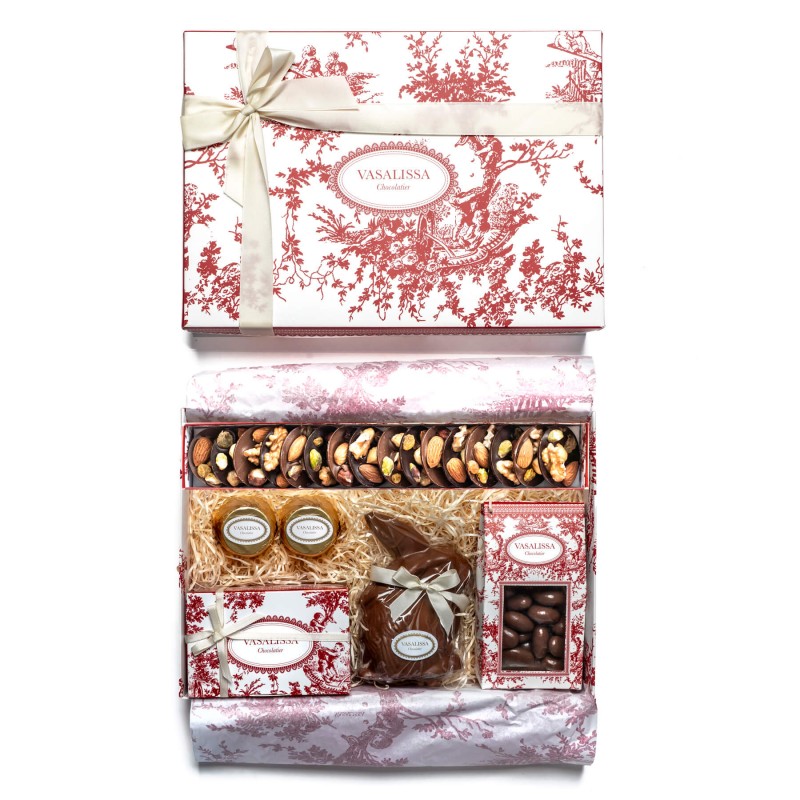 Caja con caja de mendiants, 2 gianduiottos, conejo chico de leche, almendras bañadas y baúl de 6 bombones.
