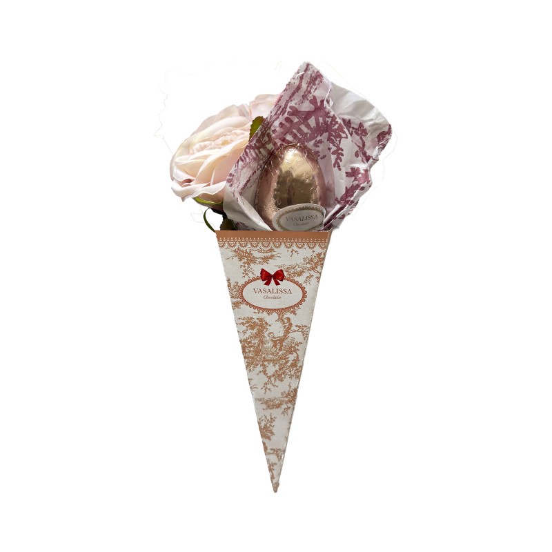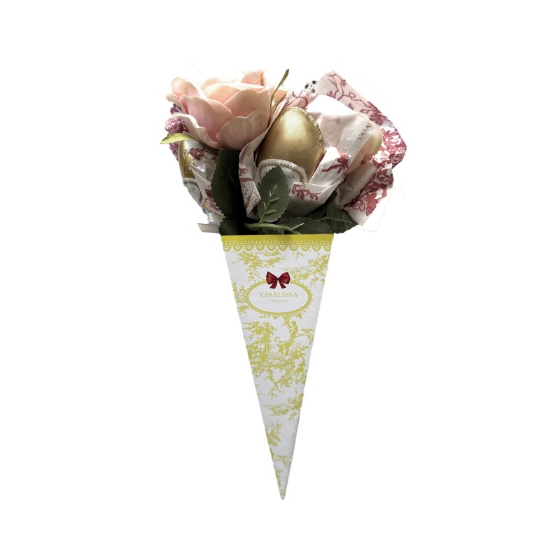 Cono de flores con 1 chupetín huevo de chocolate amargo relleno de praliné de avellanas, 1 chupetín huevo de chocolate con leche relleno de maracuyá, 1 chupetín huevo de chocolate rosa relleno de frambuesa y rosas.