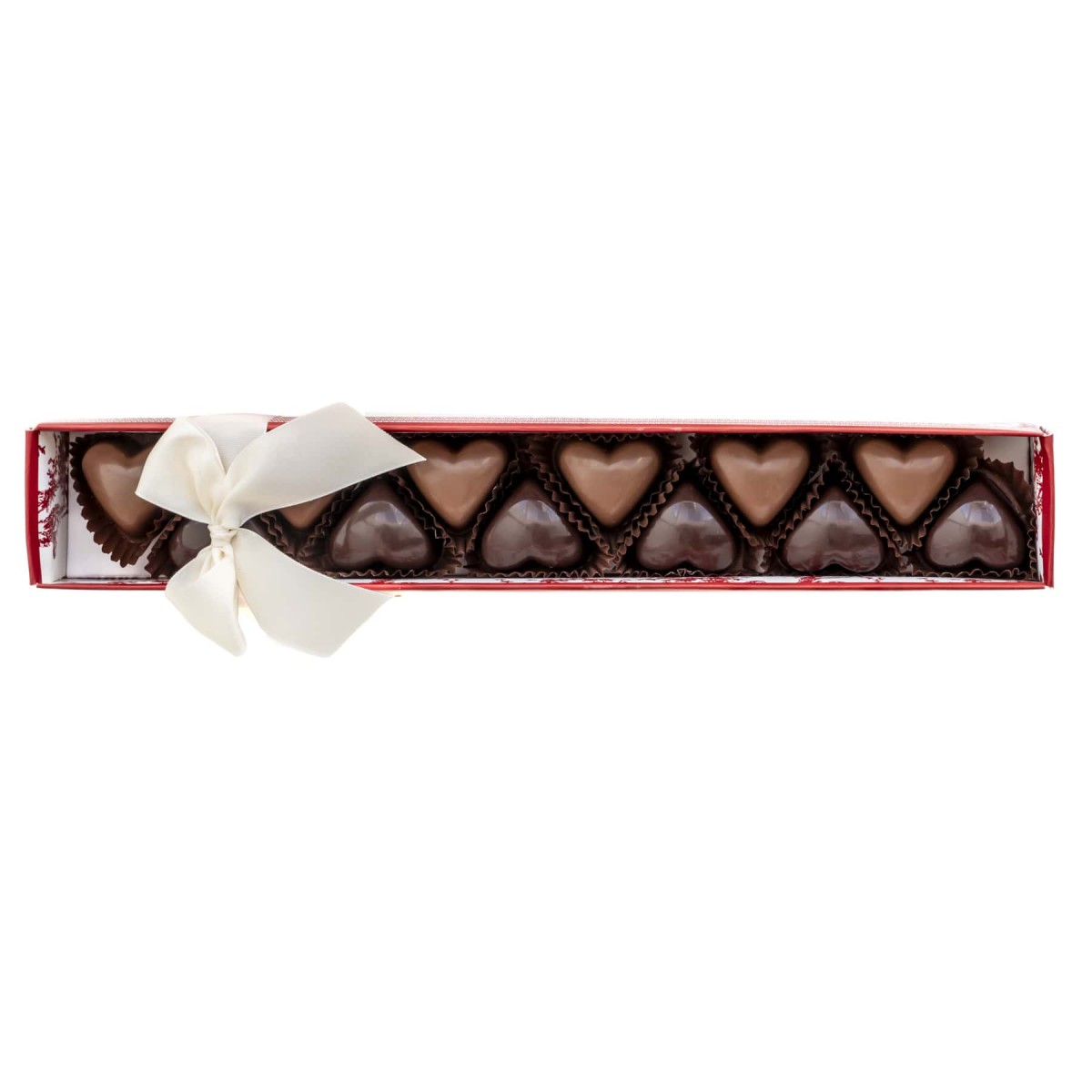 12 corazones de chocolate leche y chocolate amargo rellenos con dulce de leche
