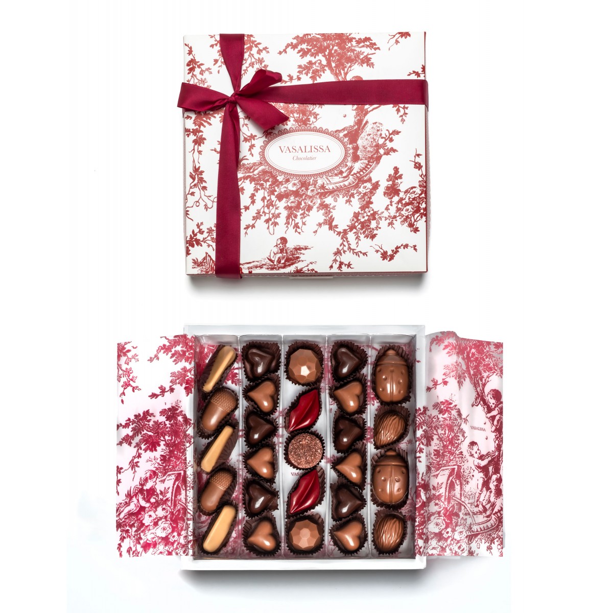 Diamante de leche, Ghianda de almendras , Corazón de dulce de leche, Vaquita San Antonio leche, Vaquita de San Antonio de leche con dulce de leche, Beso de dulce de leche y rhum, Gianduia , Nuez y Trufa frutos rojos.