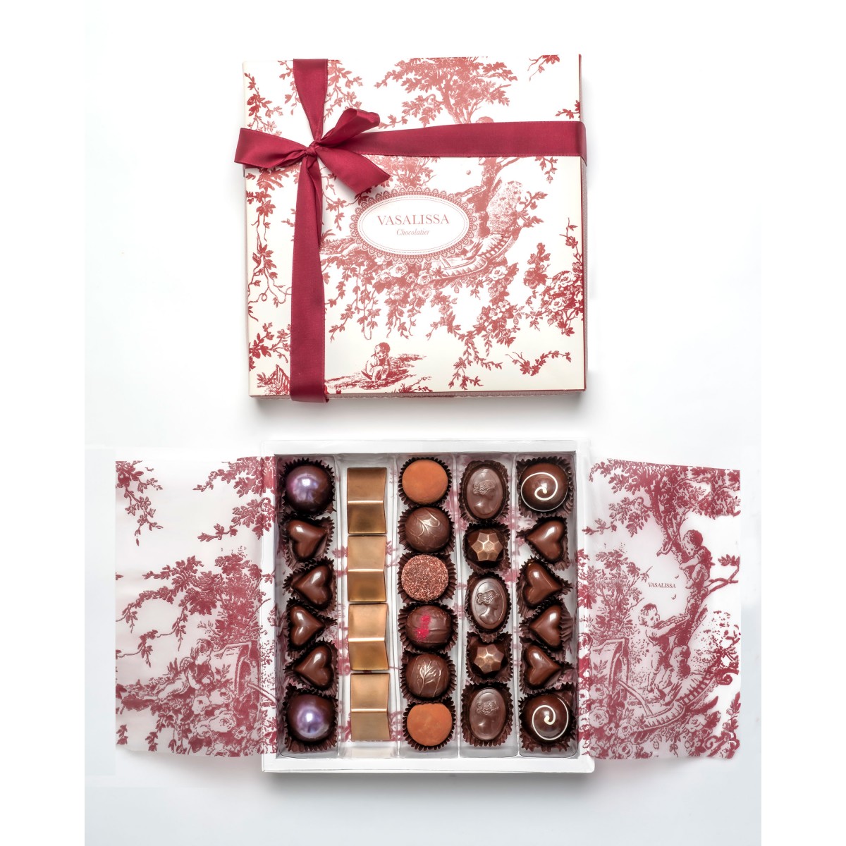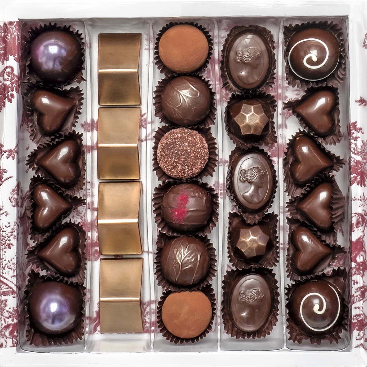 Dôme de frambuesas y amarenas, Dôme Fruta de la Pasión, Vasalissa de amaretto, Trufa clásica, Trufa rhum, Pirámide de Perú, Trufa frutos del bosque,Trufa frutos rojos. Menta con chocolate amargo, y Corazón de dulce de leche.