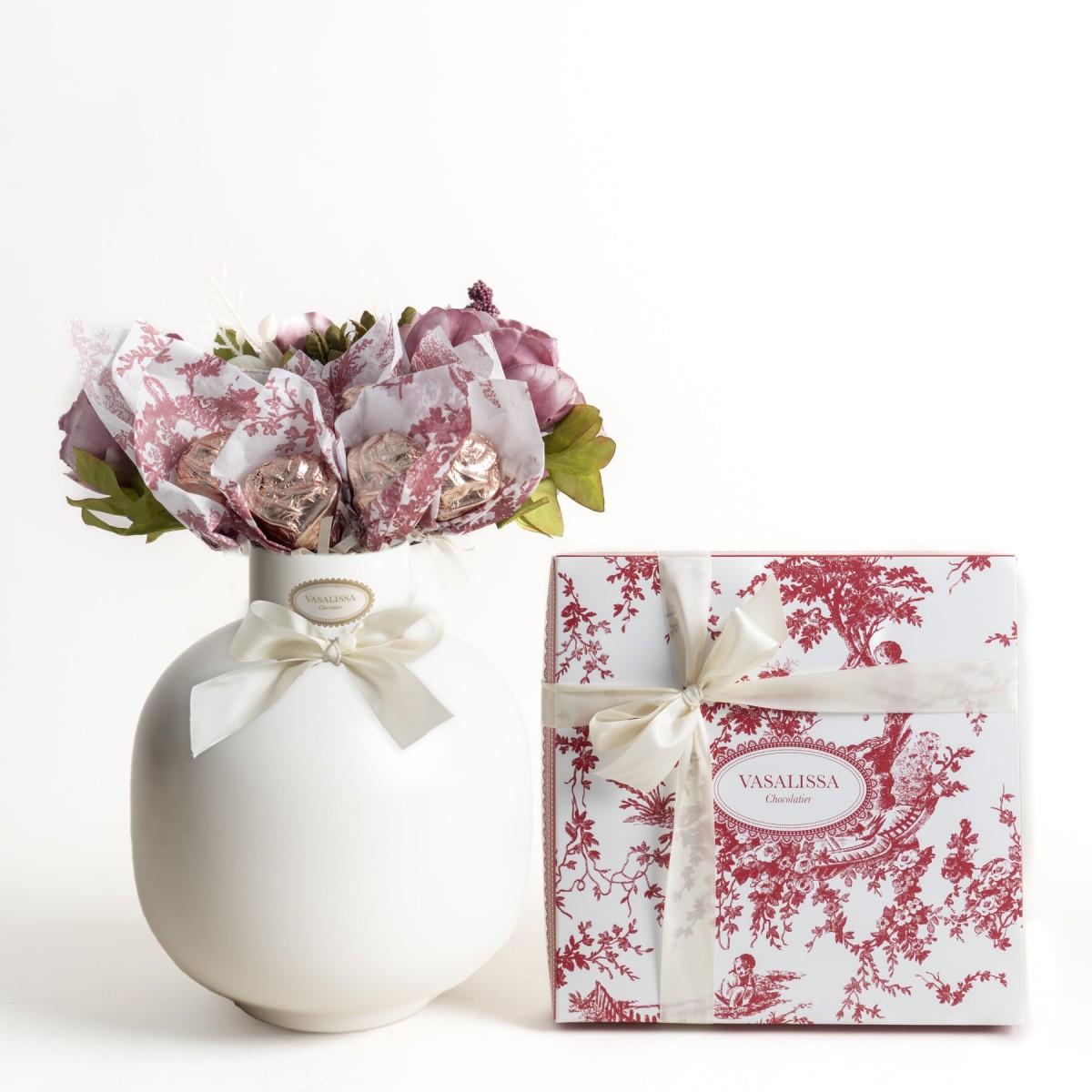 Caja Vasalissa de 25 bombones y trufas con ramo de flores Y florero