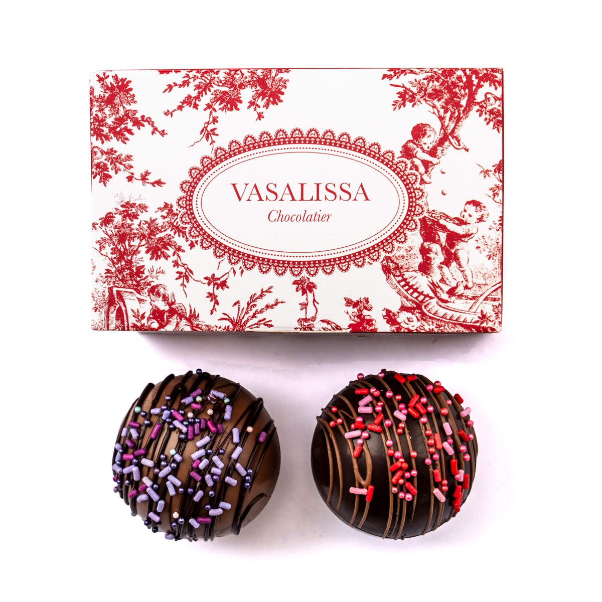 Boom mellow, 1 pompa de chocolate con leche y otra de chocolate amargo con sprinkles, con sorpresas de malvaviscos