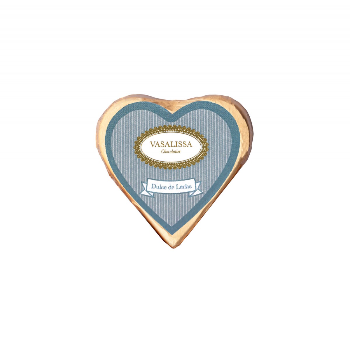 Medallón en forma de corazón de chocolate con leche relleno de dulce de leche.