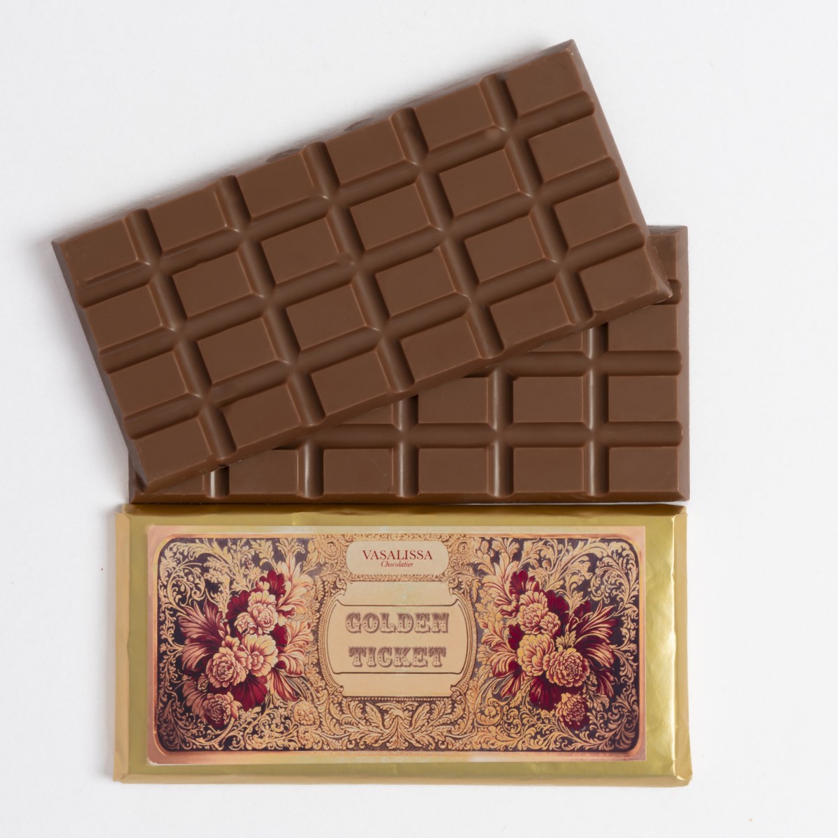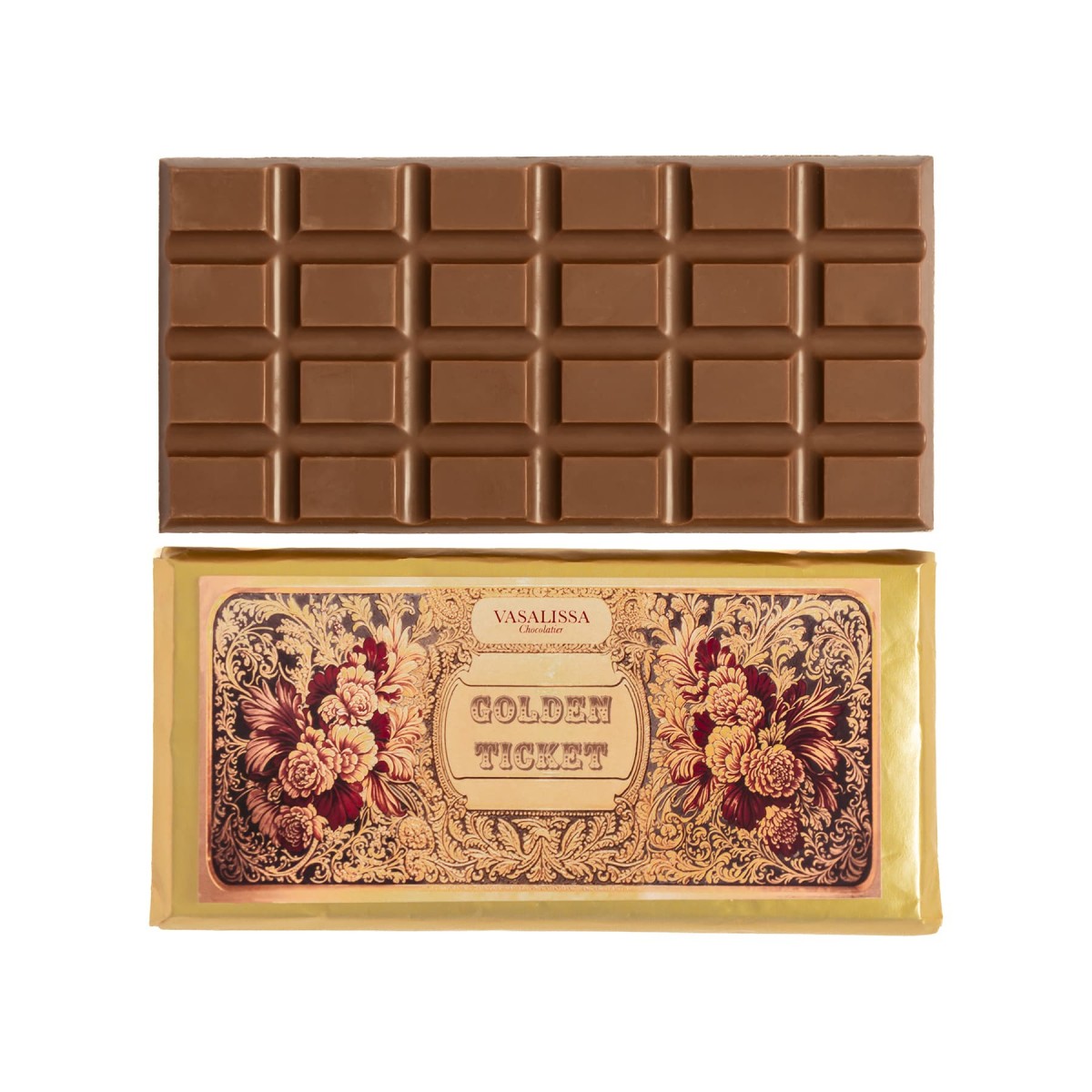 Tableta de chocolate con leche. Puede encontrar el Golden Ticket adentro. El premio es una caja de 25 trufas y bombones. Si lo encuentra, lo puede canjear en cualquiera de nuestras sucursales con el ticket. Válido hasta el 28 de febrero de 2025