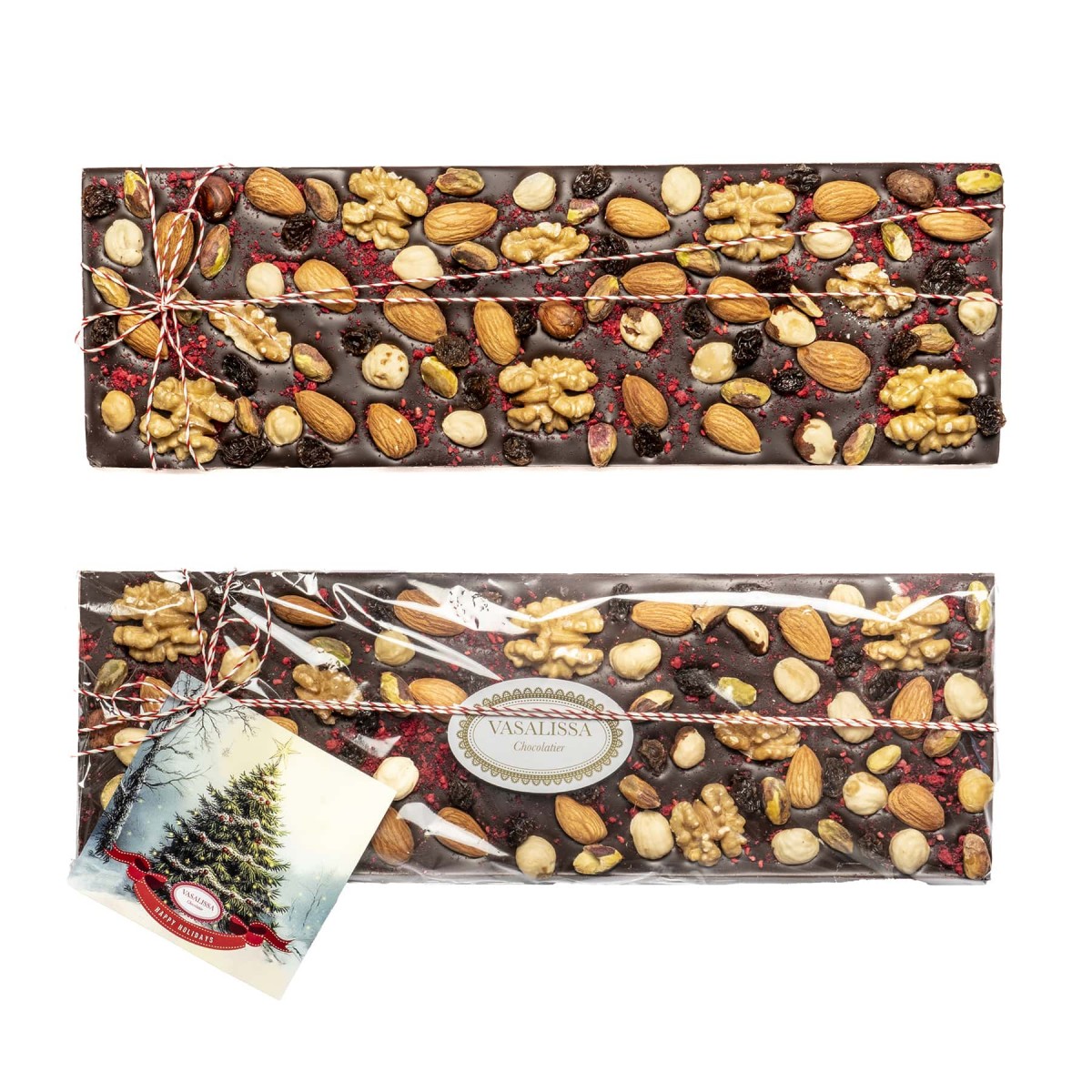 Tableta de chocolate amargo con pasas de uva, nueces, almendras y pistachos