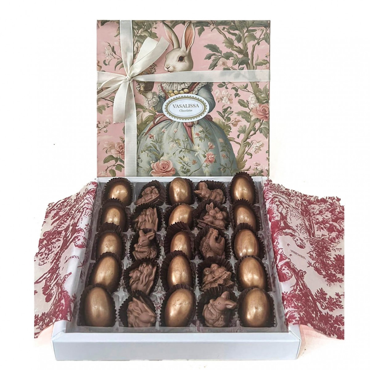 Caja con medios huevos rellenos de dulce de leche y figuras de pascua de chocolate de leche.