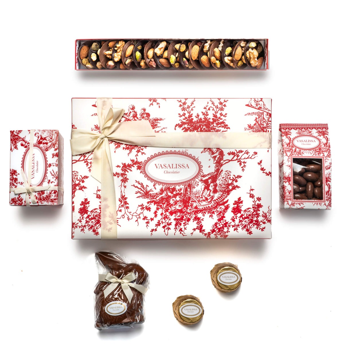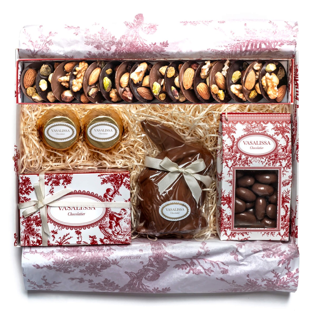 Caja con caja de mendiants, 2 gianduiottos, conejo chico de leche, almendras bañadas y baúl de 6 bombones.