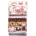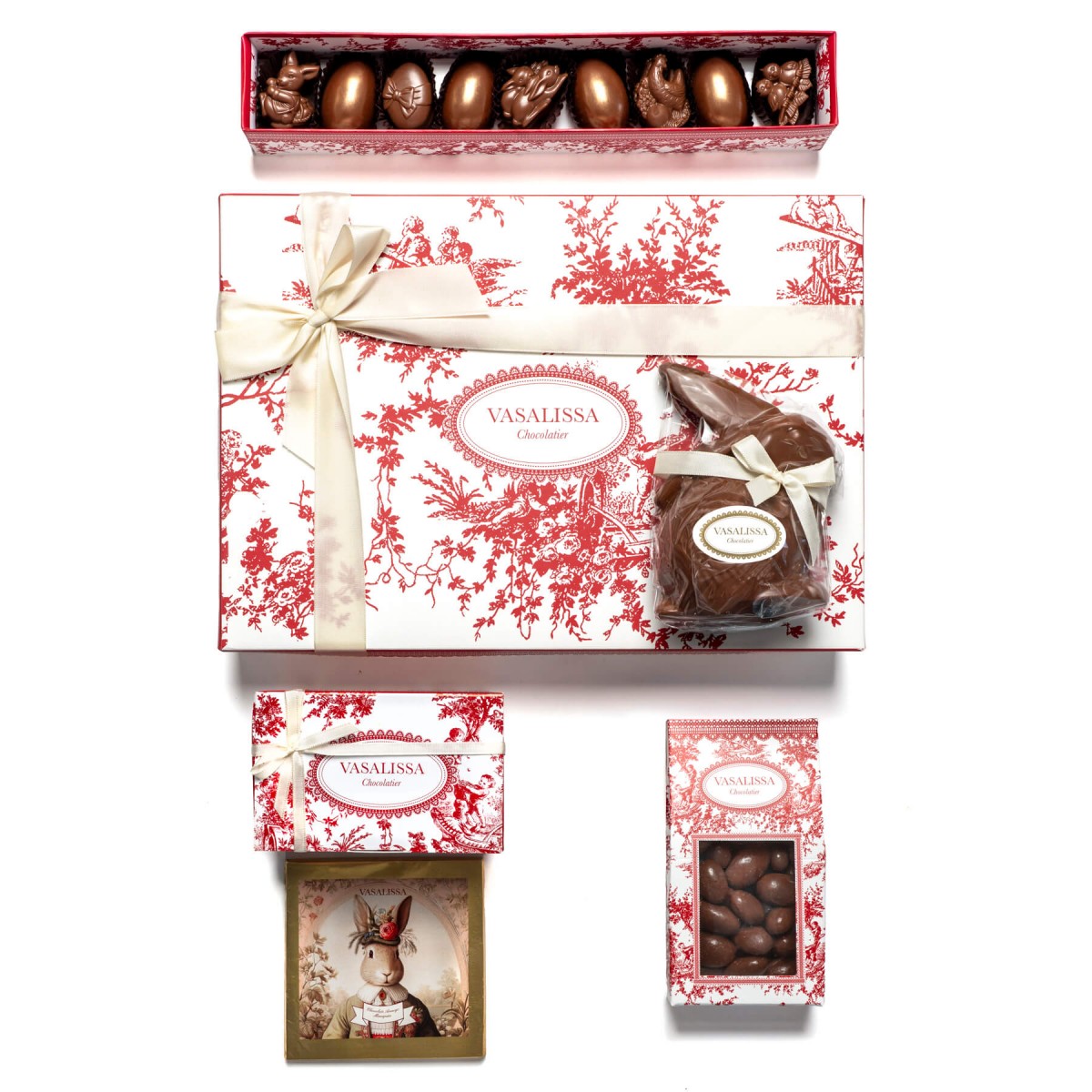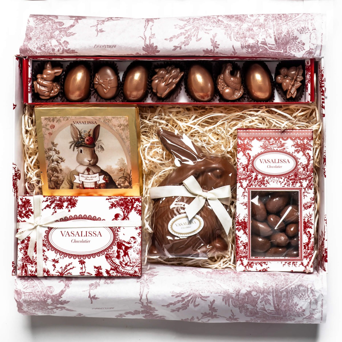 Caja con caja de figuritas de pascua , baúl con 6 bombones, almendras bañadas, tableta de pascua, conejo chico de leche.