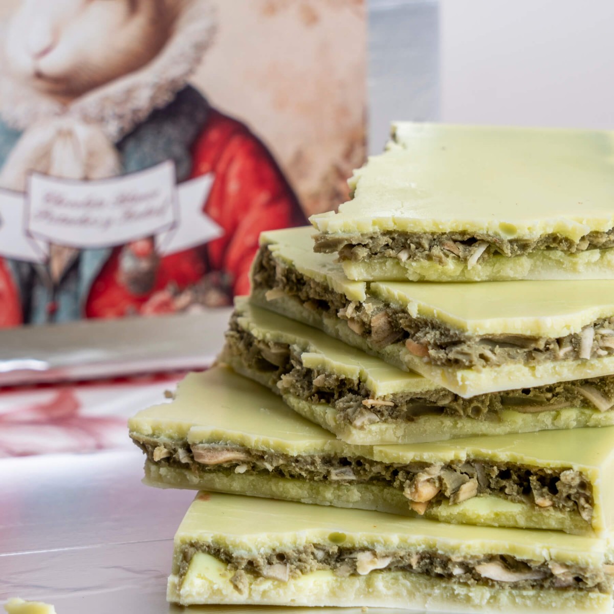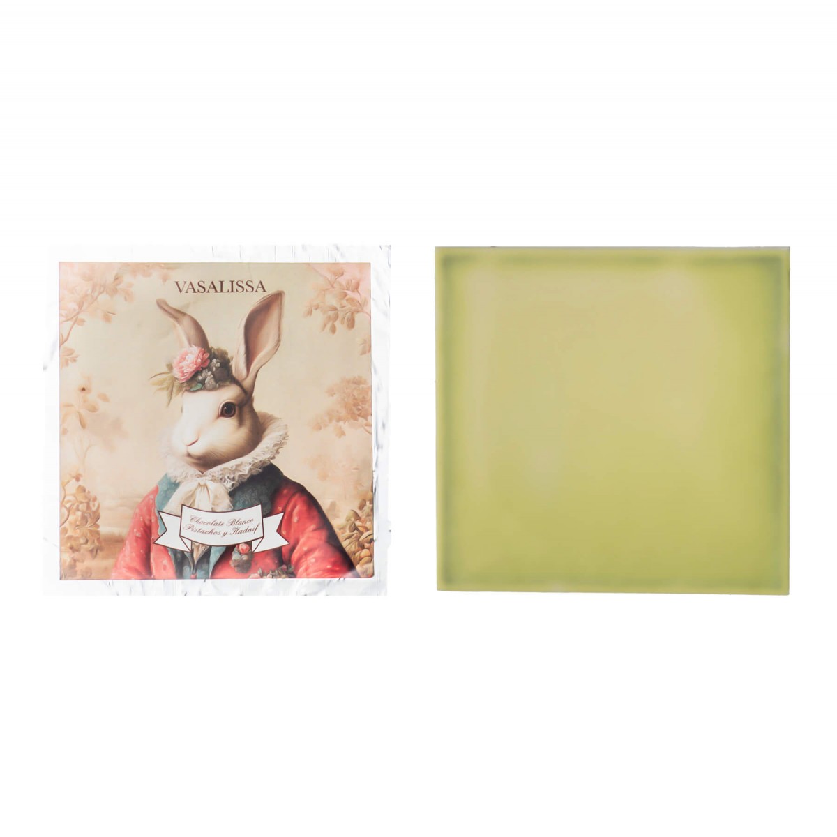 Tableta de chocolate blanco relleno de pistacho.