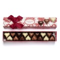 Caja de 16 corazones rellenos de dulce de leche de chocolate con leche , chocolate amargo y chocolate blanco.