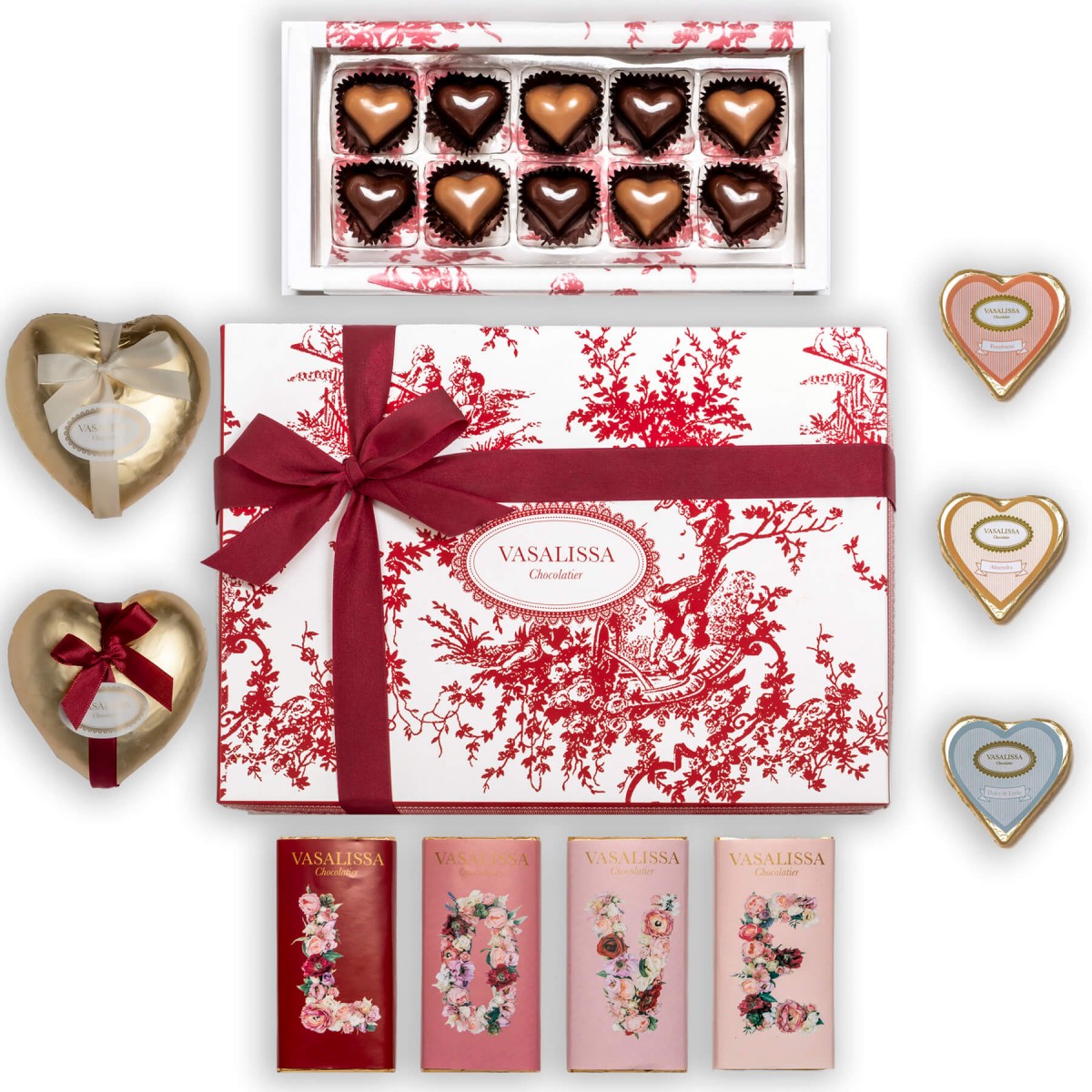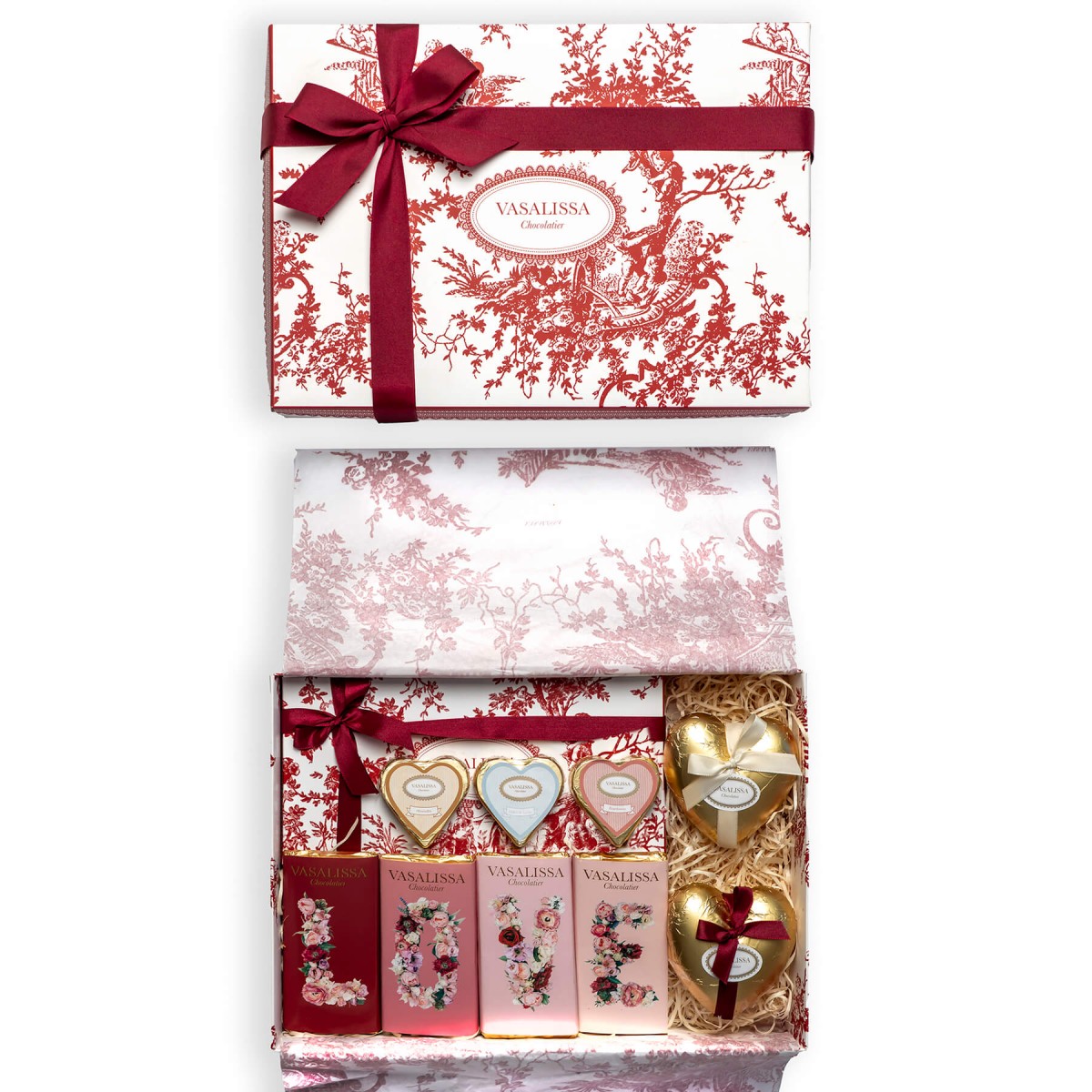 Caja con 10 corazones rellenos de dulce de leche, tabletas LOVE x 4 unidades, 2 cajas corazón chico (1 de chocolate de leche y 1 de chocolate semi amargo) 3 medallones rellenos en forma de corazón (1 frambuesa, 1 almendra, 1 dulce de leche)