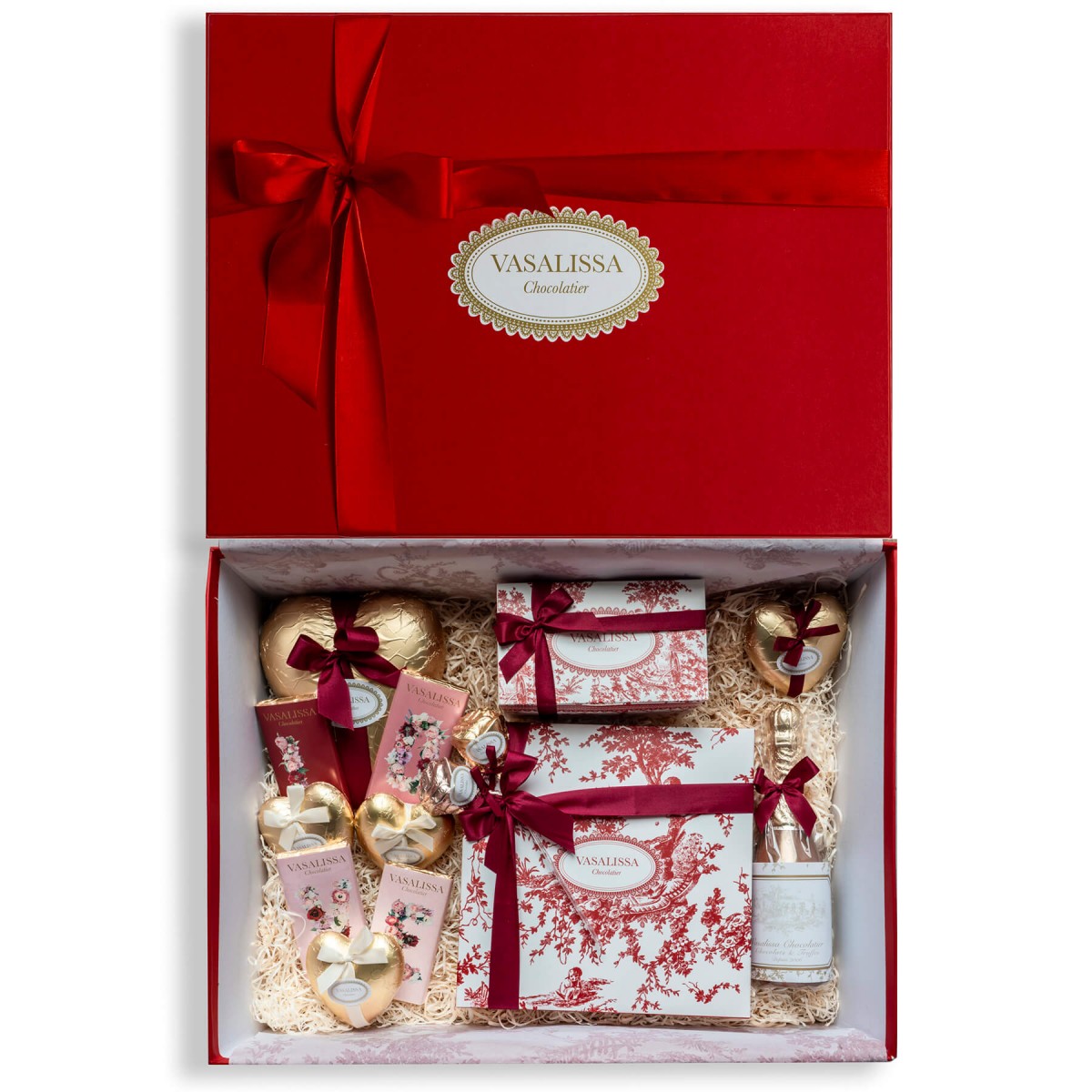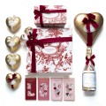 Tabletas LOVE x 4 unidades, 4 cajas corazón chico, ballotin de 8 bombones, botella de champagne de chocolate con leche, 2 chupetínes de chocolate, caja corazón grande y caja de San Valentín de 25 corazones rellenos